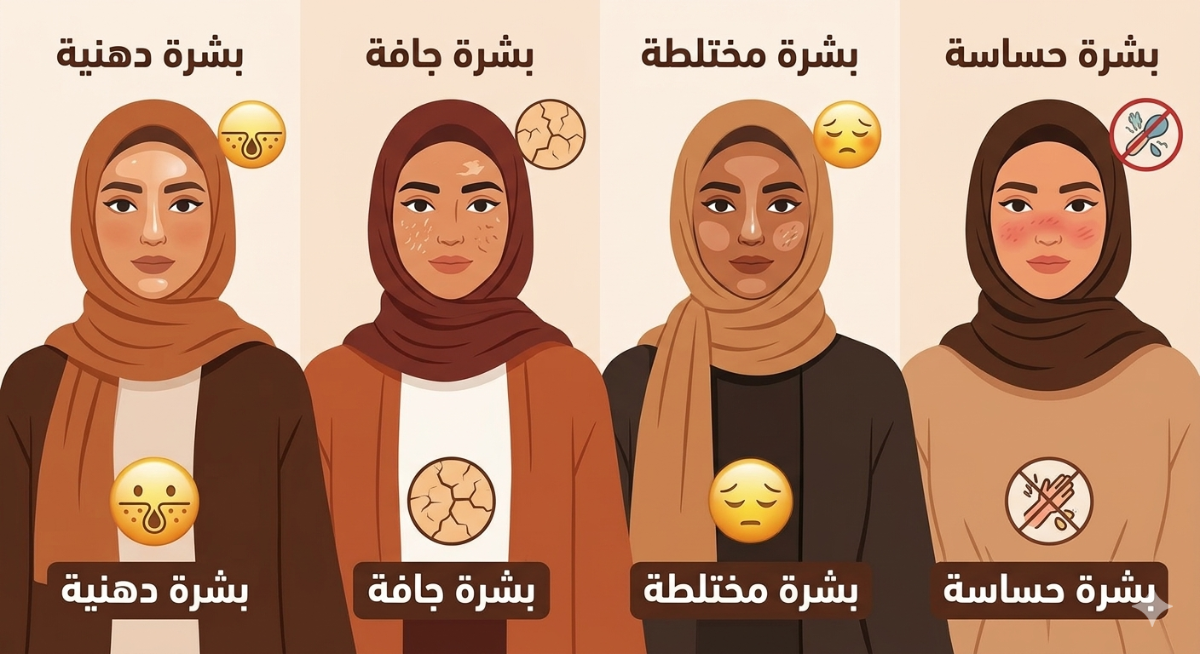 قبل أن نبدأ في تفاصيل روتين العناية بالبشرة، علينا التوقف قليلاً. هل تعرفين عدوك وصديقك؟ البشرة أربعة أنواع رئيسية، وفهمها هو نصف المعركة:
